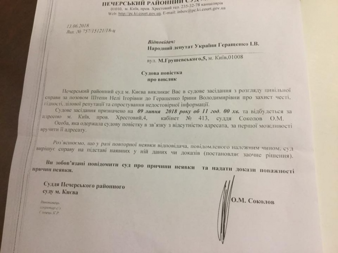 "Це просто свято якесь. Після беркутівців, звинувачуваних в причетності до вбивств на Майдані, які подали на мене в суд у справі "захисту честі і гідності", тепер ще й Неля Штепа, яка кликала "русский мир" на Донбас, вирішила зі мною судитися, й теж у справі " честі і гідності"", – повідомила Геращенко.
