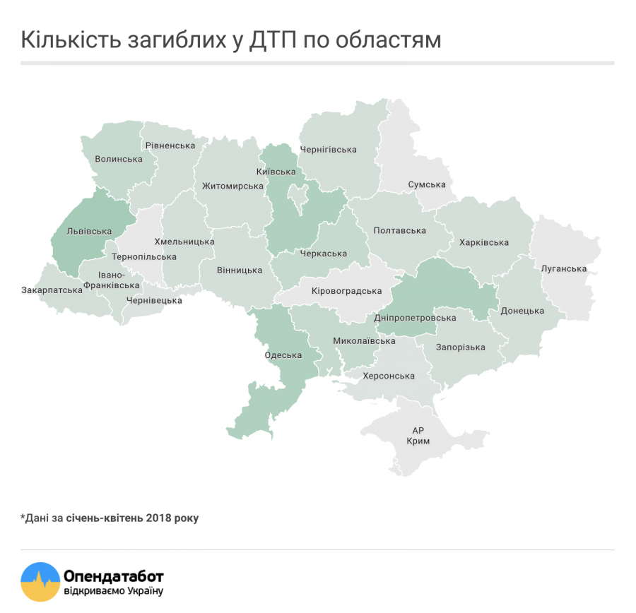 Найбільша кількість ДТП за січень-квітень 2018 року відбулися у Києві (11990), далі йдуть Одеська (3842), Харківська (3689), Київська (3410), Львівська (3272) та Дніпропетровська (3228) області.