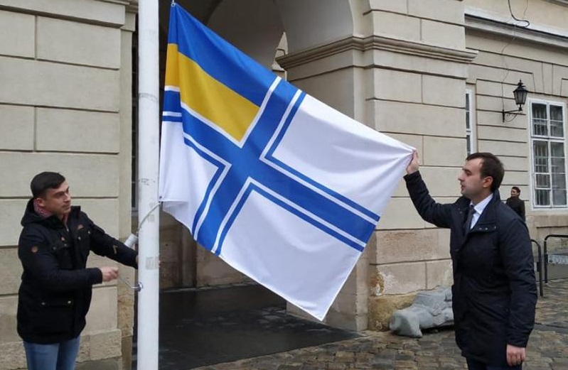 "Солідарні з полоненими українськими моряками. Прапор ВМС України на флагштоку біля Львівської ратуші.