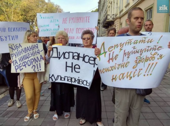 Протестувальники тримають плакати з написами «Диспансер – не Кульпарківська!», «Малій психіатрії бути!», «Захистимо конституційні права пацієнтів» та вимагають у депутатів не голосувати за реорганізацію згаданих медзакладів.