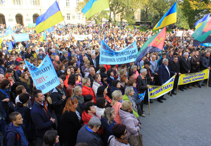 Сьогодні, 9 жовтня, викладачі Львівщини провели акцію протесту перед пам’ятником Івану Франку. Близько 3000 (половина з них - студенти) осіб вимагали від держави оплати праці в розмірі не менше, як 7 700 грн.