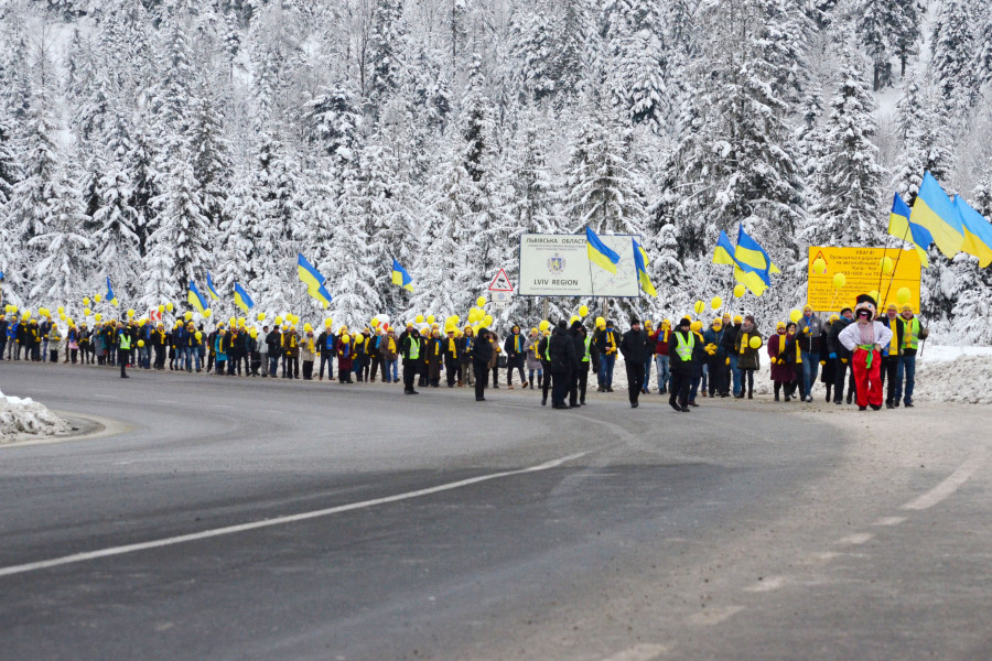 Понад 150 мешканців з обох регіонів з'єдналися, відтворивши символічний Ланцюг єдності, що його українці створили на зорі Незалежності 21 січня 1990 року.