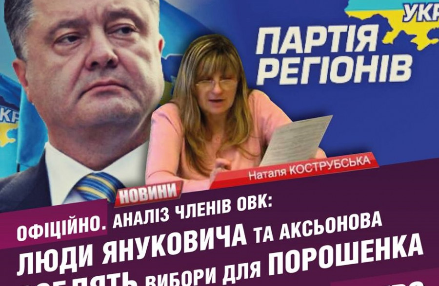 "Заступником голови ОВК №187 від Порошенка зараз працює одіозна “махрова регіоналка” Наталія Кострубська. А до цього вона регулярна представляла в комісіях Партію регіонів (уже навіть після втечі Януковича), - 2014р., 2012р., 2007р. А ще: М. Добкіна в 2014р. та В. Януковича в 2010р. У 2015-му на місцевих виборах її відсторонили від керівництва Обласною ВК за те, що в порушення закону самостійно уклала угоду на 1 600 000 грн. на друк бюлетенів. Тоді вона представляла БПП.