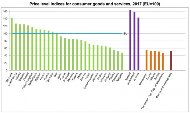 У 2017 році рівень цін на споживчі товари і послуги в Європейському Союзі сильно відрізнявся, в деяких країнах вони були майже втричі більші, ніж в інших.