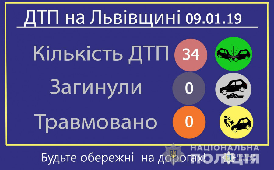 За минулу добу на автодорогах Львова та області сталось 34 дорожньо-транспортних пригоди, усі без постраждалих, повідомили у Відділі комунікації поліції Львівської області.