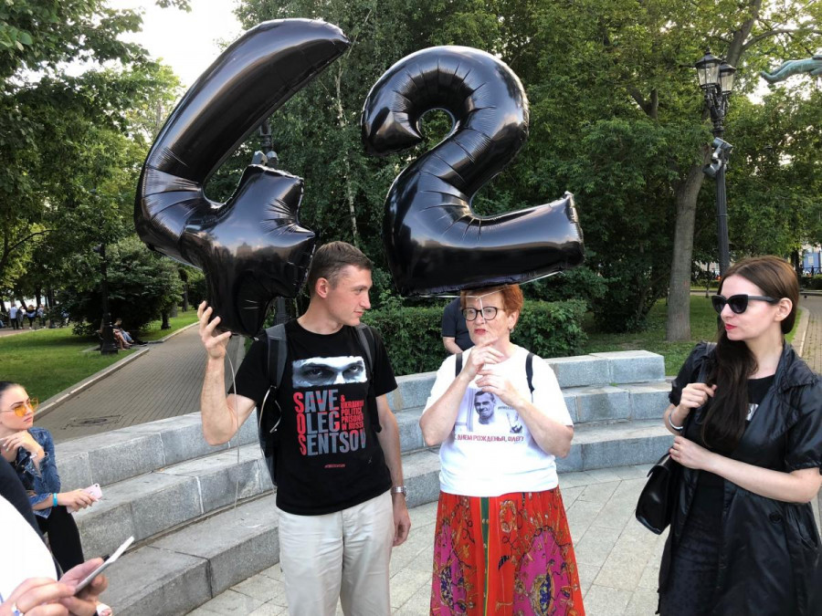 Олег Сенцов відзначає вже п'ятий день народження за ґратами На футболках учасників акції написано: «#FreeSentsov», «Із Днем народження, Олеже», «Свободу Сенцову». Крім того, в руках вони тримають дві повітряні кульки з цифрами 42.