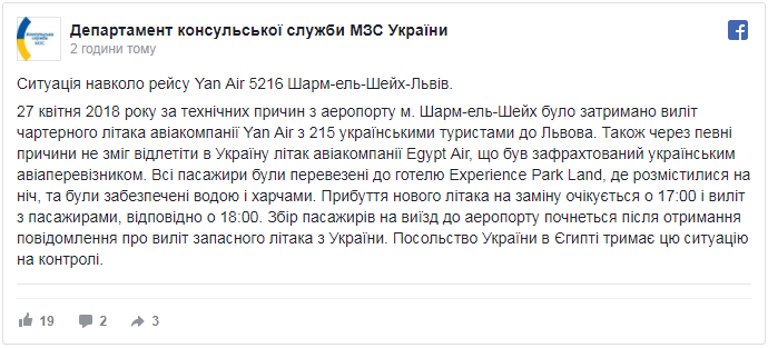 У Департаменті консульської служби МЗС України також повідомили, що виліт чартерного літака авіакомпанії YanAir 5216 з 215 українськими туристами до Львова з аеропорту м.Шарм-ель-Шейх було затримано 27 квітня 2018 року за технічних причин.