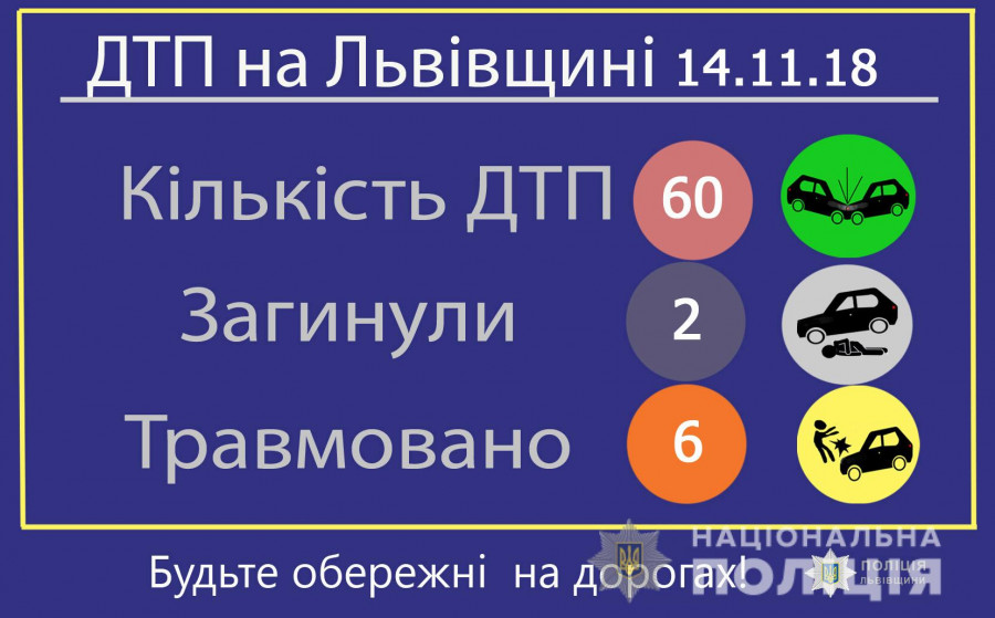 16 автопригод стались на дорогах області, інші 44 - у Львові. Внаслідок ДТП дві особи загинули та шестеро - були травмовані.