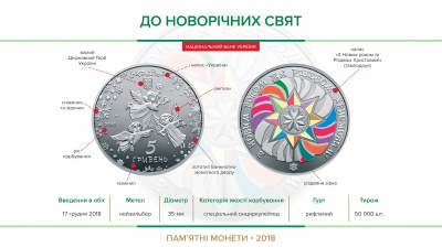 "На аверсі монети на дзеркальному тлі розміщено: угорі напис - Україна, під яким малий Державний Герб України, у центрі - три ангели; ліворуч - рік карбування монети 2018; унизу - номінал 5 гривень; по колу - стилізоване зображення сніжинок та зірочок; логотип Банкнотно-монетного двору Національного банку України (праворуч). На реверсі монети зображено кольорову різдвяну зірку - один із символів народного обряду колядування, стародавній символ сонця, вогню і тепла; навколо зірки напис: З Новим роком та Різдвом Христовим", - йдеться у повідомленні.
