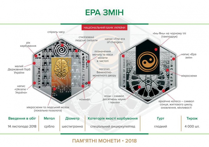 Монети "Ера миру", "Ера змін", "Ера технологій" і "Людина, час, простір" випущені номіналом в 5 грн і присвячені науці. Кожна монета має свій унікальний сюжет.