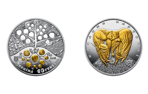 На срібній колекційній монеті зображені згорблені чоловік і жінка, а на аверсі - кущ картоплі. 22 травня цього року монету запустять в люди.