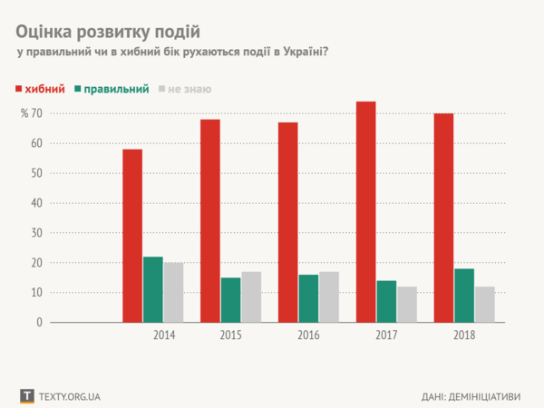 За опитуванням кінця 2018 року, важають, що події в Україні розвиваються у неправильному напрямку, 70% населення (58% – у 2014 р., 68% – у 2015 р., 67% – у 2016 р. 74% у 2017 р.), у правильному напрямку розвитку подій впевнені 18% (22% – у 2014 р., 15% – у 2015 р., 16% – у 2016 р., 14% у 2017 р.) і 12% (20% – у 2014 р., 17% – у 2015 р., 17% – у 2016 р., 12% – у 2017) своєї думки не визначили.