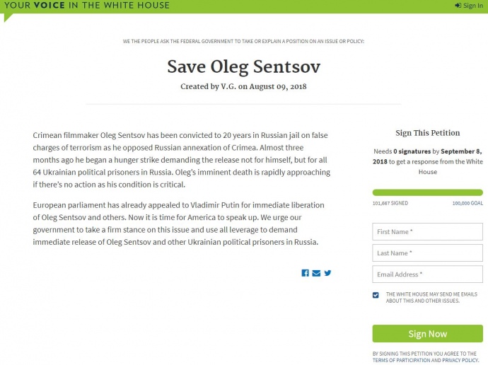 Петиція до адміністрації президента США Дональда Трампа щодо українського режисера і політв’язня Кремля Олега Сенцова набрала необхідну кількість голосів.