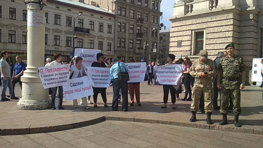 На момент візиту Президента біля Львівської опери стояли протестувальники з плакатами, на яких було написано, що начебто Садовий краде бюджетні гроші.