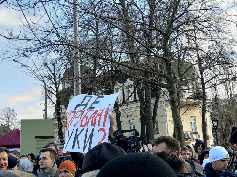 Активісти, які вимагали покарання винних у розкраданні бюджетних коштів виділених для розвитку оборонної сфери, з плакатом, на якому написано: «Де відрубані руки?» в ході виступу Петра Порошенка почали вигукувати: «Ганьба!».