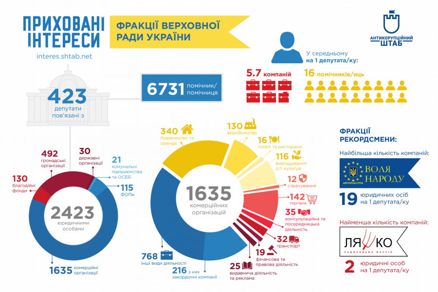 Презентація результатів дослідження бізнес-інтересів народних депутатів відбулась 30 травня та показала масштаби взаємопроникнення бізнесу і політики в Україні. Так, за даними Антикорупційного штабу з 423 нардепами та їх родинами пов'язано 2423 юридичні особи. Тобто в середньому кожна депутатська родина володіє майже 6 компаніями. У порівнянні з депутатами міських рад, цей показник більше в 1,5-2 рази.