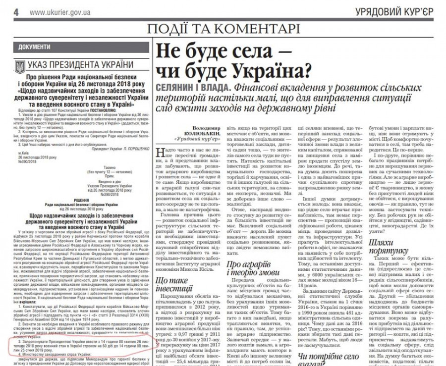 Офіційна газета Кабінету міністрів України "Урядовий кур'єр" опублікувала указ Президента Петра Порошенка про введення воєнного стану на 60 діб, бо такою є процедура.