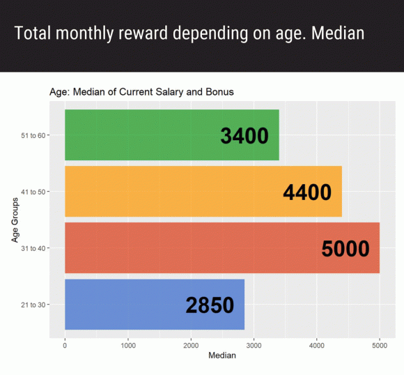 Вік більшості учасників опитування (97 осіб) від 31 до 40 років. Середня заробітна плата топ-менеджера цього віку найбільша і становить 5 тисяч доларів.