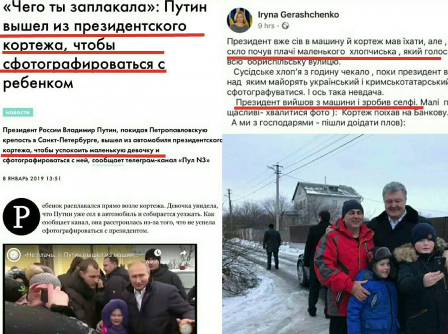 Нагадаємо, що зовсім недавно ЗМІ показали два фото. На одному – великий вуличний банер, що його як виборчу рекламу використовувала партія “Єдина Росія” і Путін. На іншому – виборчий плакат Блоку Петра Порошенка "Солідарність". На першому напис російською – «Реальные дела, а не пустые обещания», а другому калька українською - "Реальні справи, а не брехливі обіцянки".