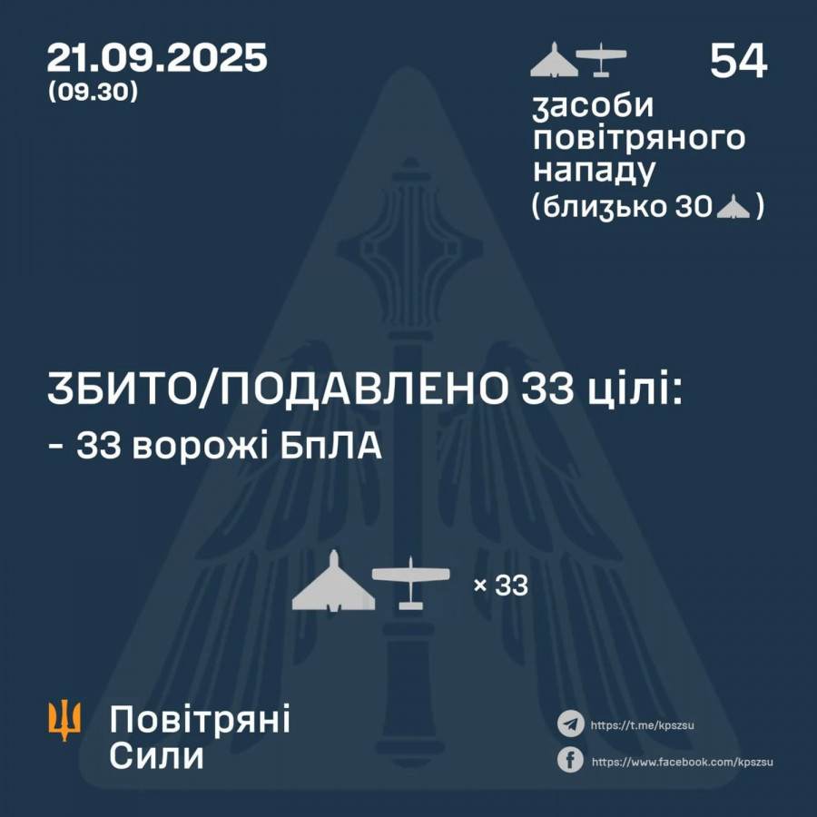 У ніч проти 21 вересня російські війська здійснили масовану атаку на Україну, випустивши 54 ударні безпілотники, серед яких Shahed та дрони інших типів.