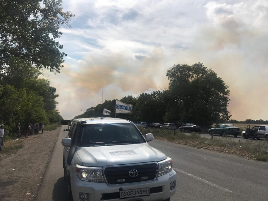 "За спостереженнями СММ ОБСЄ, контрольний пункт в'їзду-виїзду (КПВВ) в підконтрольному урядові Новотроїцькому тимчасово закритий через пожежі, які викликали детонацію мін у даному районі", - сказано в повідомленні.
