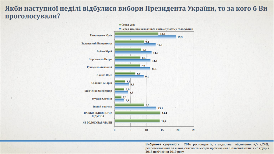 Рейтинг: Тимошенко - 19,3%, Зеленський - 12,9%, Бойко - 11,6%, Порошенко - 11,3%, Гриценко - 11,1%
