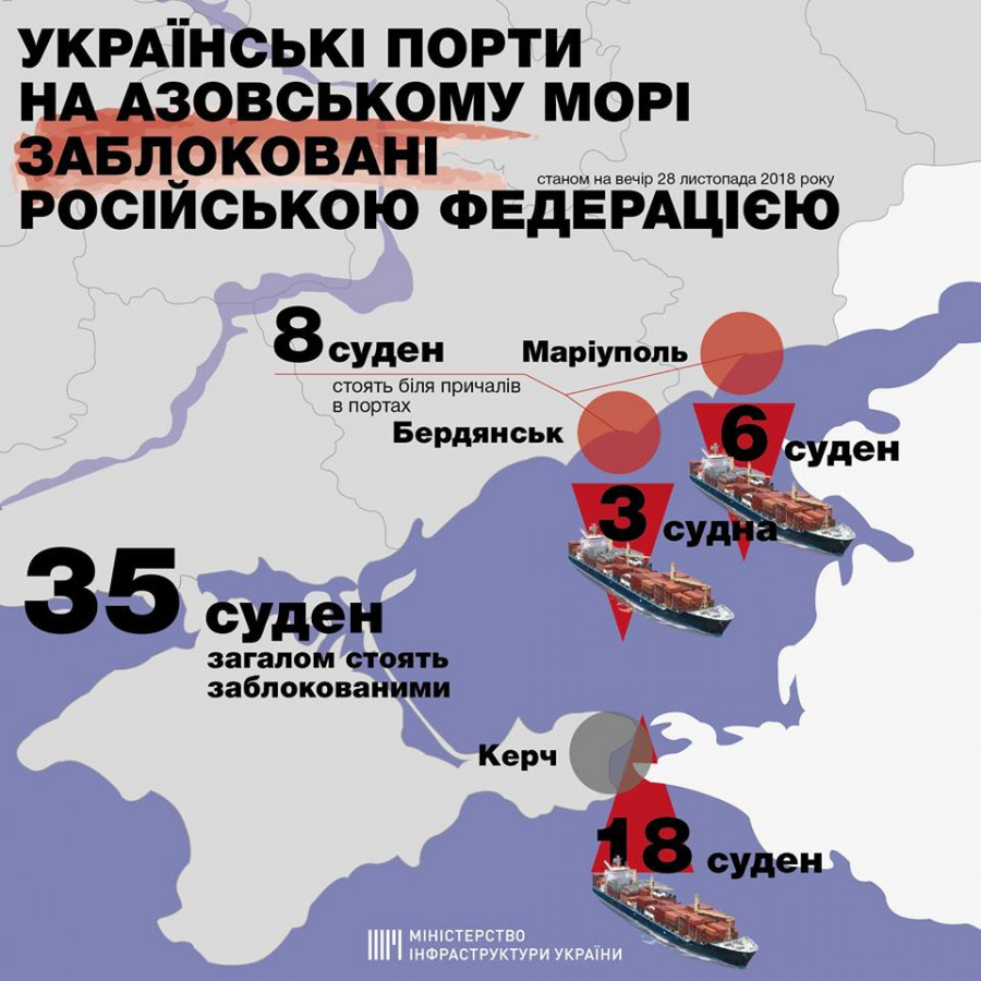 Станом на вечір 28 листопада українські порти Азовського моря Маріуполь та Бердянськ фактично заблоковані Російською Федерацією для заходу та виходу суден. Про це на своїй сторінці у Фейсбук повідомив міністр інфраструктури Володимир Омелян.