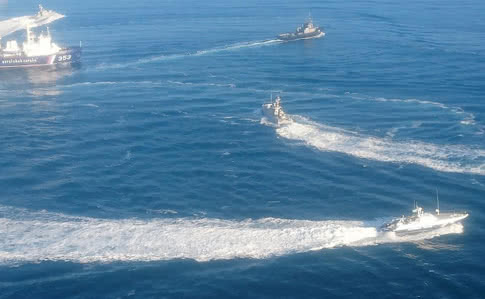Щоб уникнути обстрілу, українські кораблі почали розходитися у морі, і за "Бердянськом" пішов один з прикордонних кораблів РФ.