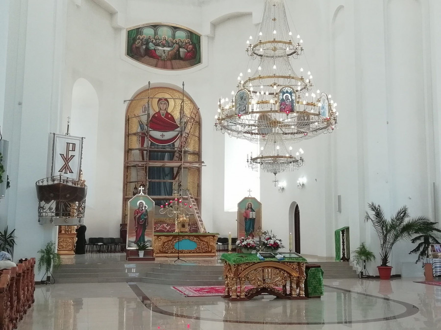 По обох боках Богородиці є постаті двох ангелів, які не тільки представляють "небесні сили безтілесні", але й є частиною Тріумфальної Небесної Церкви.