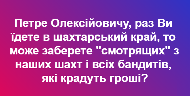 І найголовніше прохання від шахтарів Червонограда: "Петре Олексійовичу, раз Ви їдете в шахтарський край, то може заберете "смотрящих" з наших шахт і всіх бандитів, які крадуть гроші?".