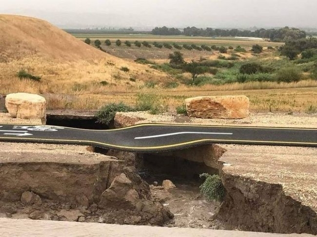Нещодавно країна пережила наслідки катаклізму, який завдав величезних матеріальних збитків і забрав життя більше десятка людей. В цьомувипадку від повені стався обвал грунту, а ось дорога, що проходить під ним, лише просіла, не давши жодної тріщини.