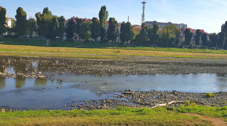 Між мостом Масарика на пішохідним видніється каміння. Власне на сушу перетворилося 70 відсотків річки на цій ділянці. Вода дуже мілка, глибина – лише в ямах декілька сантиметрів, повідомив Закарпатпост.