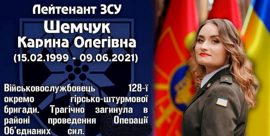 Учора (9 червня) під час виконання службових обов’язків трагічно загинула військовослужбовець 128-ї окремої гірсько-штурмової бригади, лейтенант Карина Шемчук.