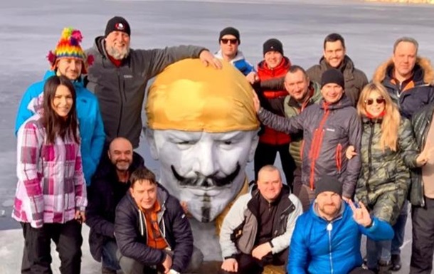 Бюсту намалювали вуса і борідку, потім одягли жовту бандану і спустили на дно в парку-музеї Новомиколаївського кар'єра.