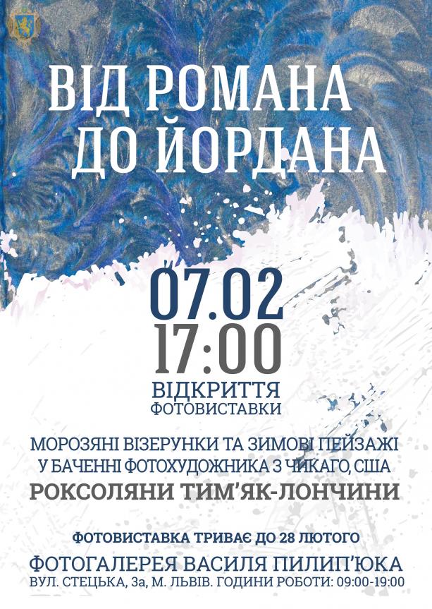 У четвер, 7 лютого, о 17:00 год у фотогалереї Василя Пилип’юка відбудеться відкриття виставки робіт фотохудожника з Чикаго Роксоляни Тим'як-Лончини «Від Романа до Йордана».