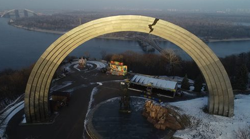 Активісти і правозахисники у суботу наклеїли тимчасову наклейку у вигляді тріщини на Арку дружби народів у Києві на знак підтримки українських політв'язнів, які незаконно утримуються в РФ та анексованому Криму.