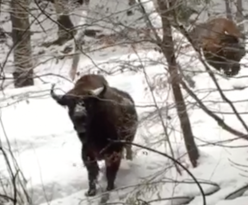 У Чернівецькій області люди зустріли в лісі двох зубрів: тварини підійшли дуже близько до людей.