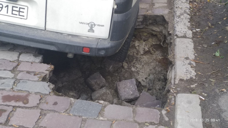 Сьогодні, 25 жовтня, у Львові, на вулиці Марка Вовчка, на проїзній частині, раптово утворилось провалля, у яке заднім колесом провалився автомобіль “Fiat Doblo”.