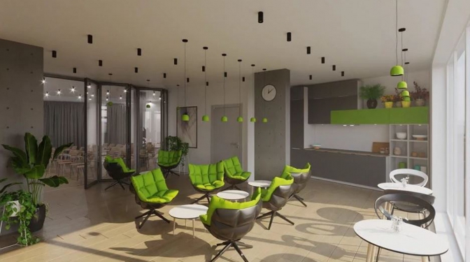 Проект розробили ГО Urbanideas, за яким на площі 300 кв. м облаштують два поверхи. На першому розмістять бібліотеку, конференц-зал та лаундж-зону з кухнею, а також гардероб та інклюзивний санвузол. На мінус першому поверсі має з’явитись молодіжний центр зайнятості, робоча кімната, індивідуальні переговорні, ділова лаундж-зона та технічні приміщення.