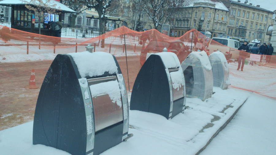 У Львові на площі Соборній облаштували перший у місті майданчик з підземними контейнерами для сортування і збору побутового сміття. Приблизна вартість контейнерного майданчика – 800-900 тис. грн.