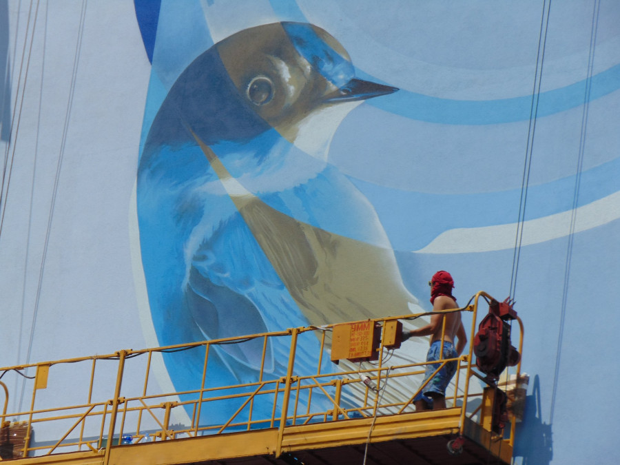 Мурал із зображенням пташки з традиційним орнаментом у поєднанні з сучасним каліграфічним письмом домальовують на стіні багатоповерхівки, що на вулиці Міцкевича,9 у Рівному.