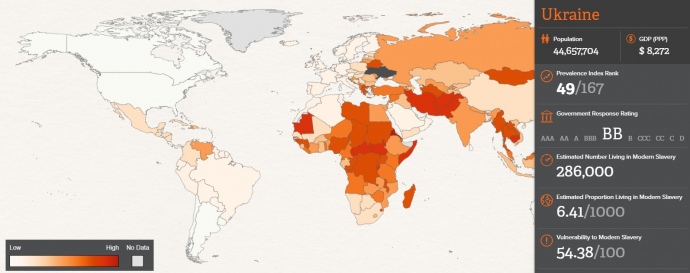 Відповідно до світового антирейтингу сучасного рабства Global Slavery Index, складеного австралійською правозахисною організацією Walk Free Foundation, частка тих, хто живе в умовах сучасного рабства, в Україні становить 6,4 на 1 тисячу осіб, передає "Українська правда".
