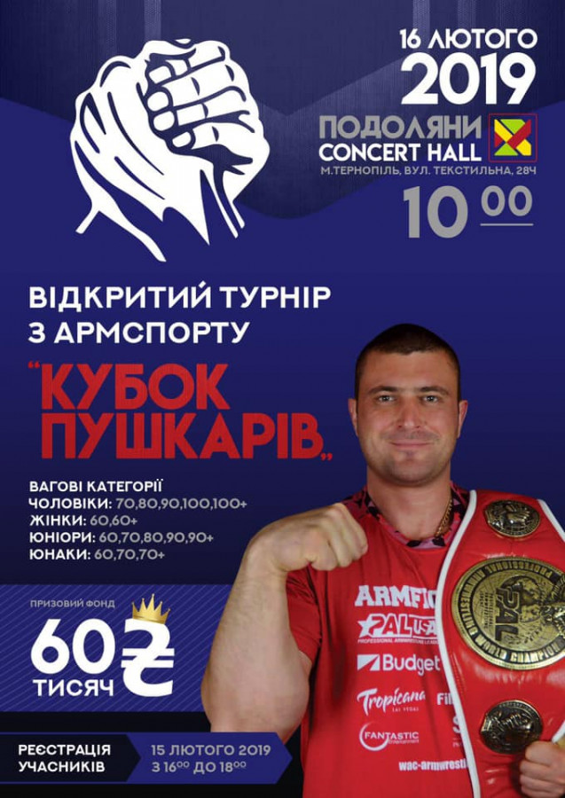В пам'ять про титулованого тернопільського рукоборця Андрія Пушкаря та його батька Анатолія в Тернополі 16 лютого відбудеться відкритий турнір з армспорту «Кубок Пушкарів».