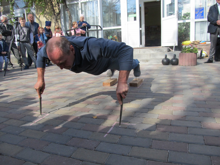 І, насамкінець, Андрій Балабух з села Яблунів Гусятинського району зумів чотири рази підняти однією рукою дві гирі вагою 32 кг, які знаходилися у вертикальному положенні, розмішені одна на одну.