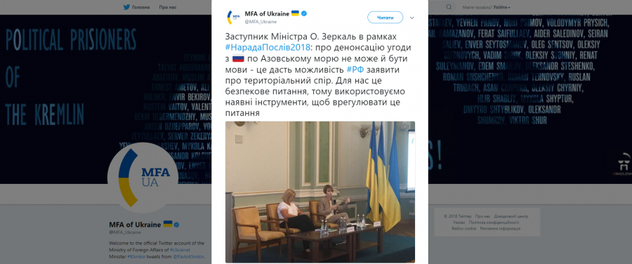 Заступник міністра закордонних справ Олена Зеркаль заявила, що Україна не буде розривати угоду з Росією щодо співпраці в Азовському морі і в подальшому буде використовувати наявні інструменти для врегулювання ситуації.
