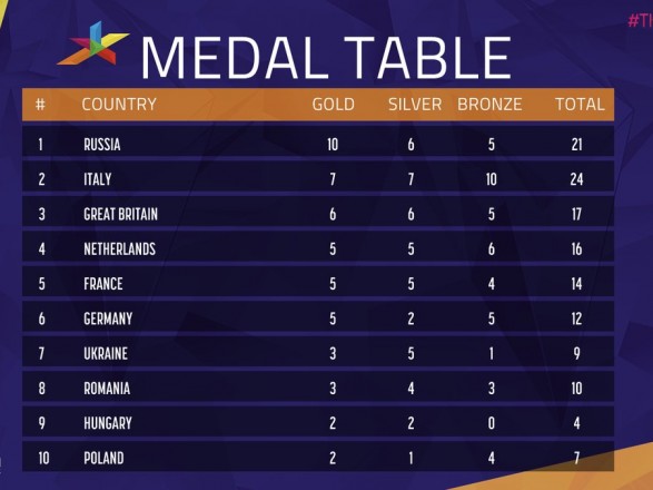 Примітно, що на вершині таблиці розмістилися Росія (10 "золотих"), Італія (7) та Велика Британія (6).
