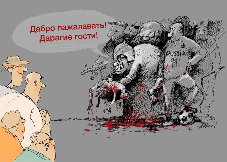 Під малюнком, який він виклав на своїй Фейсбук-сторінці, митець додав: "5 000 хохлятських мудаків поїхали на Росію посмотрєть і повболівати. О спорт ти мір! Welcome to Russia!"
