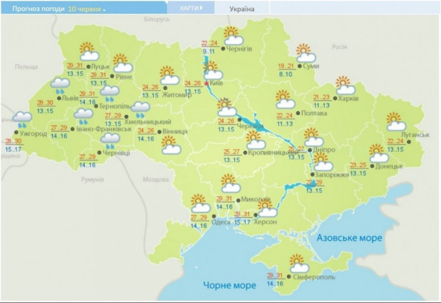 У понеділок, 11 червня, короткочасні дощі на заході країни зміняться грозовими зливами, а циклон просунеться углиб України, зачепивши Вінницьку та Житомирську області. Тепле повітря під натиском циклону зміститься на схід країни, а на заході і півдні дещо похолодає. В цілому по всій території України температура буде в рамках + 24-28 градусів.