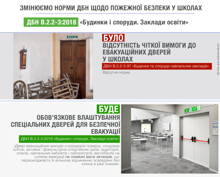 "Ми переглянули протипожежні вимоги, які містилися у старому ДБН щодо шкіл, вдосконалили та доповнили їх. Зокрема, здавалося б незначна, але така важлива зміна - тепер у школах обов'язково встановлюватимуться спеціальні двері евакуаційних виходів з вільним та легким відчиненням зсередини без ключа для того, щоб діти могли швидко та безперешкодно покинути приміщення у разі надзвичайної ситуації" - цитує заступника міністра регіонального розвитку Льва Парцхаладзе прес-служба відомства.
