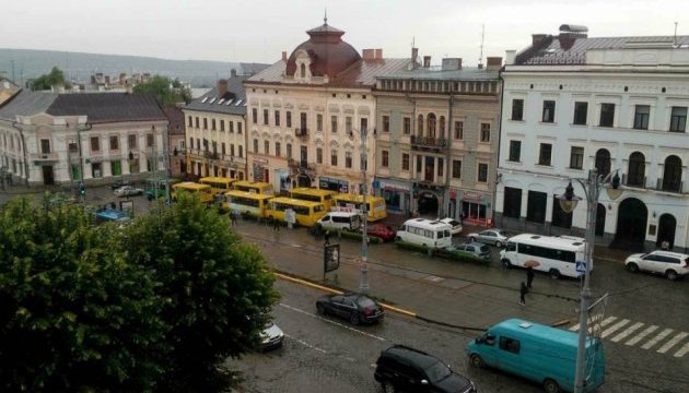 Перевізники у Чернівцях поставили свої маршрутки по всьому периметру Центральної площі, що біля міської ради.